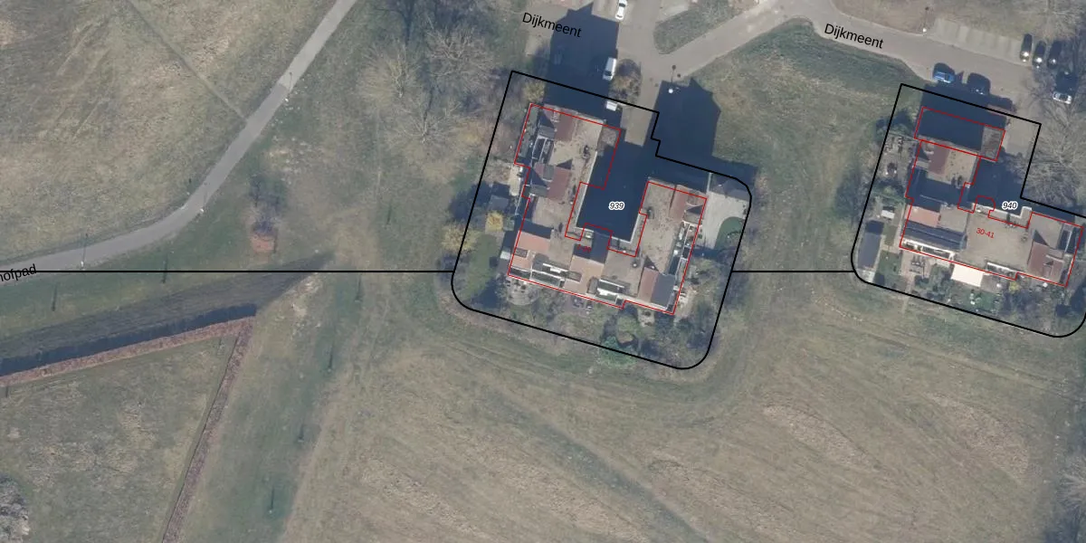 Het perceel waarop Dijkmeent 9 staat heeft een oppervlakte van 2011 m². Dit is een zeer groot perceel. De perceeloppervlakte wordt geregistreerd door het Kadaster. Gedetailleerde informatie over de maten van dit perceel kunt u vinden in het rapport Kadastrale kaart met maatvoering van Dijkmeent 9.