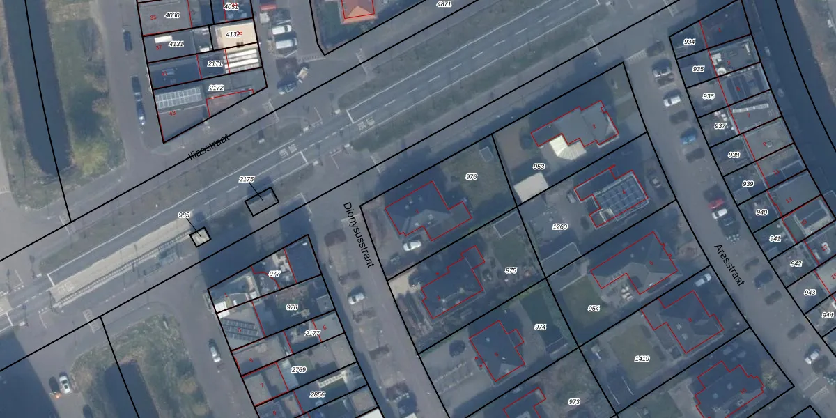 Het perceel waarop Dionysusstraat 1 staat heeft een oppervlakte van 659 m². Dit is een groot perceel. De perceeloppervlakte wordt geregistreerd door het Kadaster. Gedetailleerde informatie over de maten van dit perceel kunt u vinden in het rapport Kadastrale kaart met maatvoering van Dionysusstraat 1.