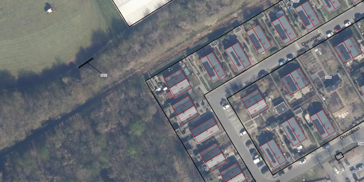 Het perceel waarop Discuslaan 23 staat heeft een oppervlakte van 6845 m². Dit is een zeer groot perceel. De perceeloppervlakte wordt geregistreerd door het Kadaster. Gedetailleerde informatie over de maten van dit perceel kunt u vinden in het rapport Kadastrale kaart met maatvoering van Discuslaan 23.