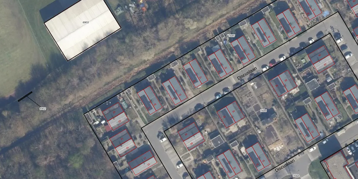 Het perceel waarop Discuslaan 33 staat heeft een oppervlakte van 6845 m². Dit is een zeer groot perceel. De perceeloppervlakte wordt geregistreerd door het Kadaster. Gedetailleerde informatie over de maten van dit perceel kunt u vinden in het rapport Kadastrale kaart met maatvoering van Discuslaan 33.