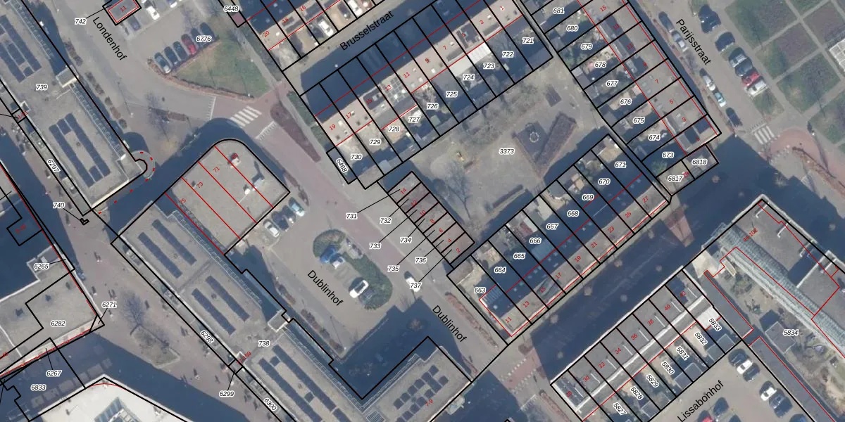 Het perceel waarop Dublinhof 10 staat heeft een oppervlakte van 25 m². Dit is een klein perceel. De perceeloppervlakte wordt geregistreerd door het Kadaster. Gedetailleerde informatie over de maten van dit perceel kunt u vinden in het rapport Kadastrale kaart met maatvoering van Dublinhof 10.