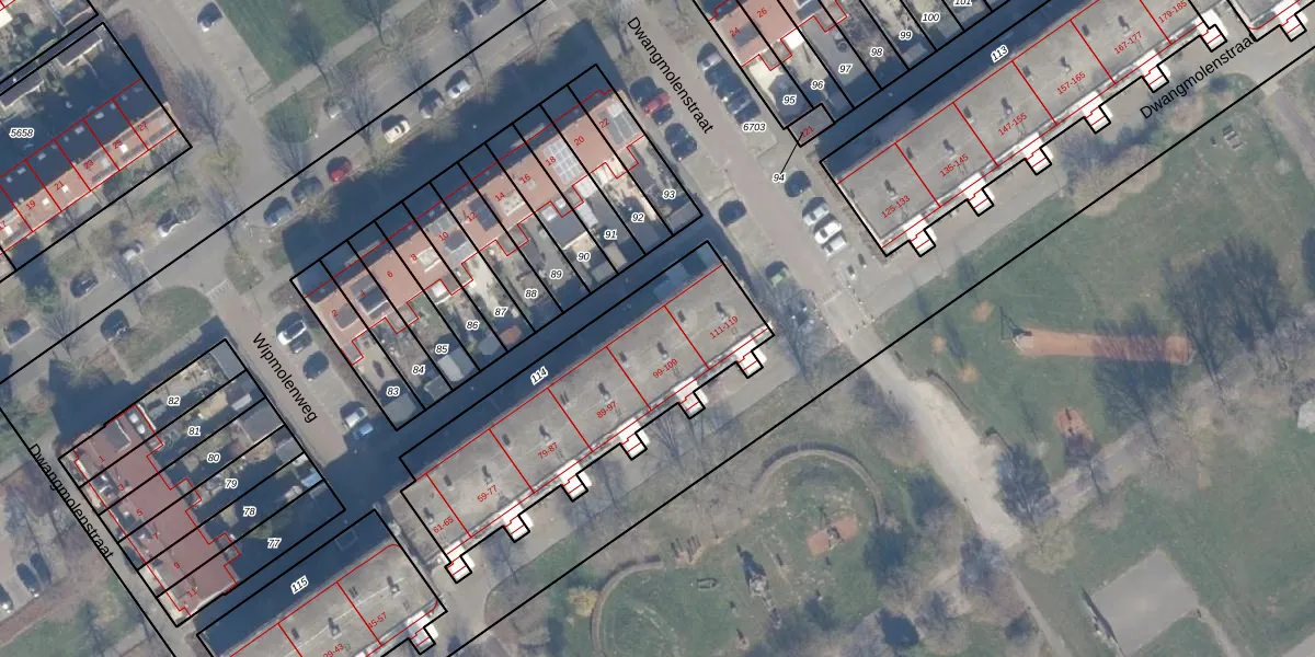 Het perceel waarop Dwangmolenstraat 105 staat heeft een oppervlakte van 1095 m². Dit is een zeer groot perceel. De perceeloppervlakte wordt geregistreerd door het Kadaster. Gedetailleerde informatie over de maten van dit perceel kunt u vinden in het rapport Kadastrale kaart met maatvoering van Dwangmolenstraat 105.