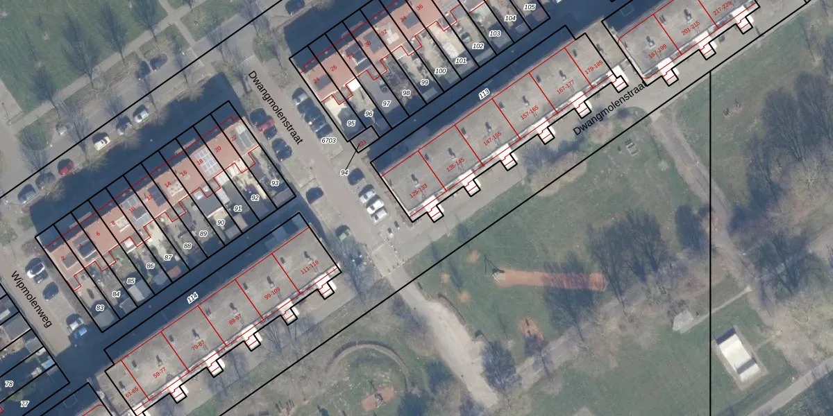 Het perceel waarop Dwangmolenstraat 125 staat heeft een oppervlakte van 1094 m². Dit is een zeer groot perceel. De perceeloppervlakte wordt geregistreerd door het Kadaster. Gedetailleerde informatie over de maten van dit perceel kunt u vinden in het rapport Kadastrale kaart met maatvoering van Dwangmolenstraat 125.