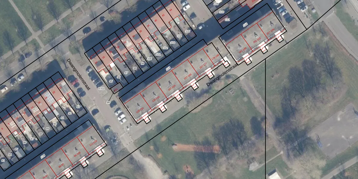 Het perceel waarop Dwangmolenstraat 155 staat heeft een oppervlakte van 1094 m². Dit is een zeer groot perceel. De perceeloppervlakte wordt geregistreerd door het Kadaster. Gedetailleerde informatie over de maten van dit perceel kunt u vinden in het rapport Kadastrale kaart met maatvoering van Dwangmolenstraat 155.