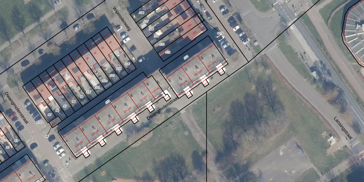 Dwangmolenstraat 187 is gelegen op kadastraal perceel AMR04N112. Deze kadastrale aanduiding is uniek en wordt gebruikt door het Kadaster om eigendomsrechten en andere zakelijke rechten vast te leggen. Het perceel maakt onderdeel uit van de kadastrale gemeente Almere.