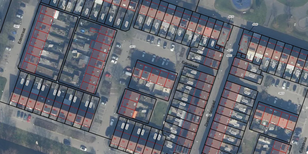 Het perceel waarop Edestraat 30 staat heeft een oppervlakte van 527 m². Dit is een groot perceel. De perceeloppervlakte wordt geregistreerd door het Kadaster. Gedetailleerde informatie over de maten van dit perceel kunt u vinden in het rapport Kadastrale kaart met maatvoering van Edestraat 30.