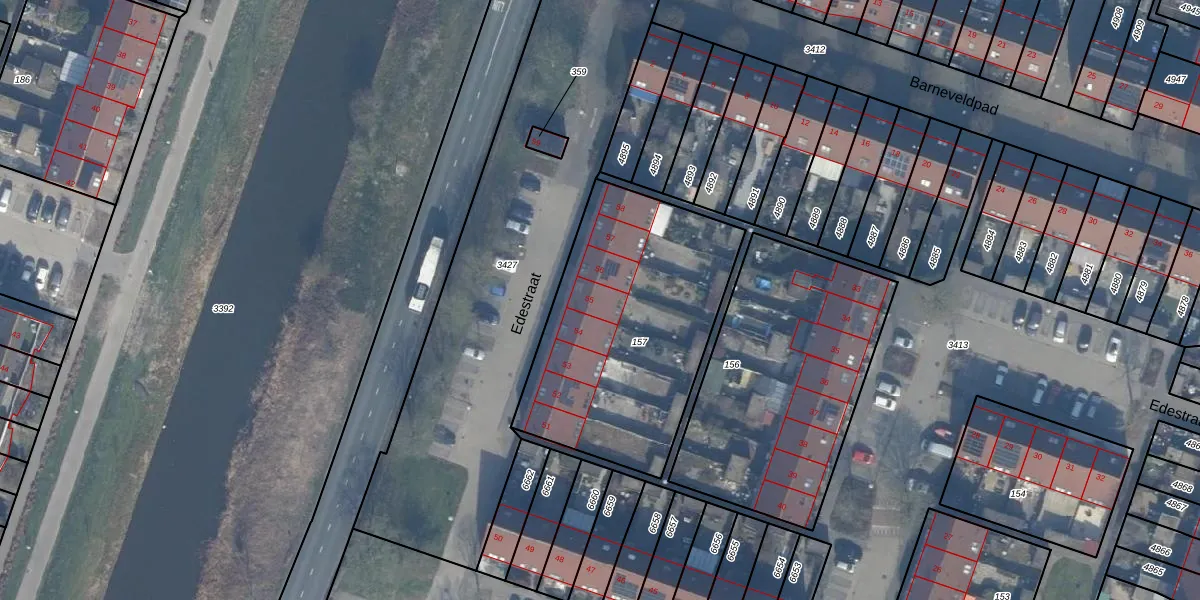 Het perceel waarop Edestraat 55 staat heeft een oppervlakte van 1159 m². Dit is een zeer groot perceel. De perceeloppervlakte wordt geregistreerd door het Kadaster. Gedetailleerde informatie over de maten van dit perceel kunt u vinden in het rapport Kadastrale kaart met maatvoering van Edestraat 55.