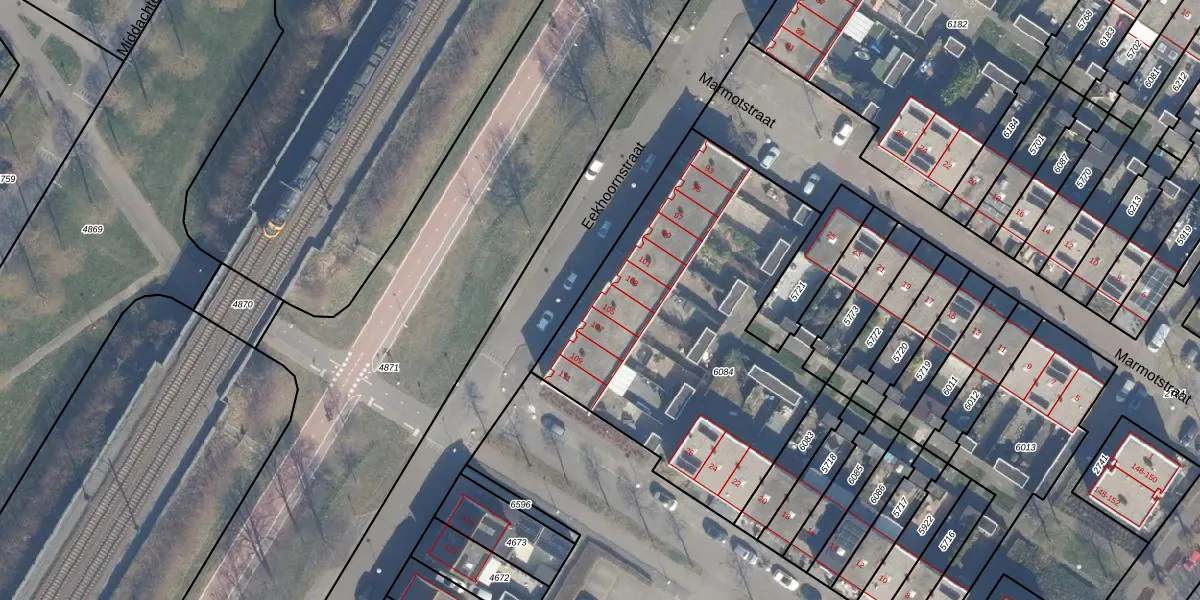 Het perceel waarop Eekhoornstraat 105 staat heeft een oppervlakte van 1857 m². Dit is een zeer groot perceel. De perceeloppervlakte wordt geregistreerd door het Kadaster. Gedetailleerde informatie over de maten van dit perceel kunt u vinden in het rapport Kadastrale kaart met maatvoering van Eekhoornstraat 105.
