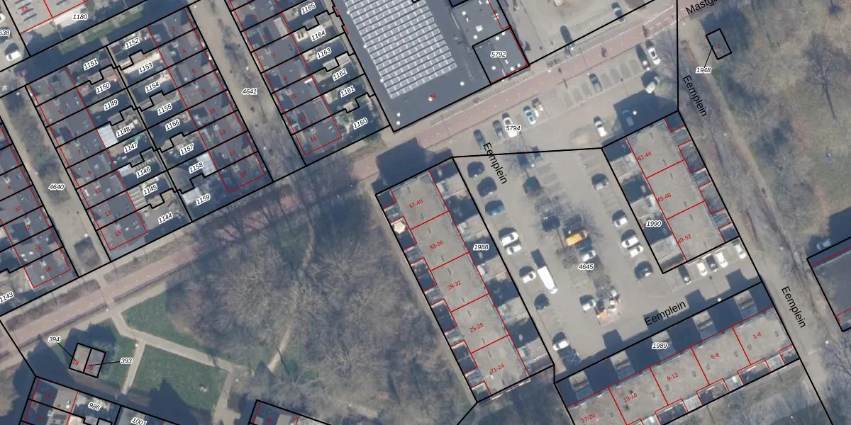 Het perceel waarop Eemplein 37 staat heeft een oppervlakte van 1094 m². Dit is een zeer groot perceel. De perceeloppervlakte wordt geregistreerd door het Kadaster. Gedetailleerde informatie over de maten van dit perceel kunt u vinden in het rapport Kadastrale kaart met maatvoering van Eemplein 37.
