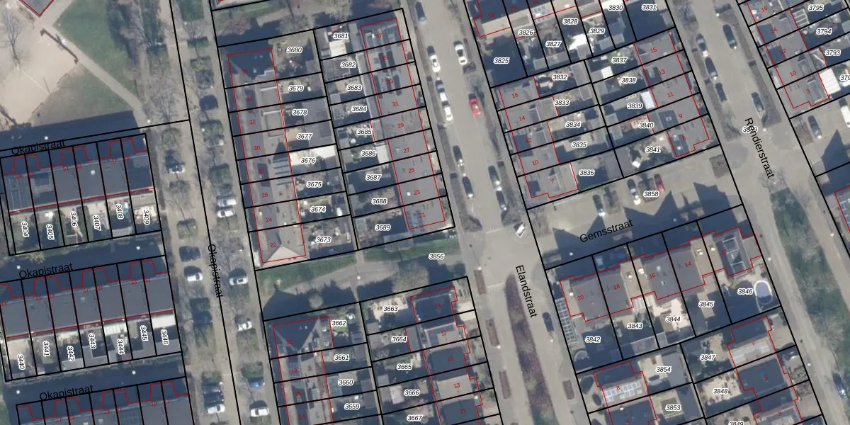Elandstraat 21 is gelegen op kadastraal perceel AMR04N3689. Deze kadastrale aanduiding is uniek en wordt gebruikt door het Kadaster om eigendomsrechten en andere zakelijke rechten vast te leggen. Het perceel maakt onderdeel uit van de kadastrale gemeente Almere.