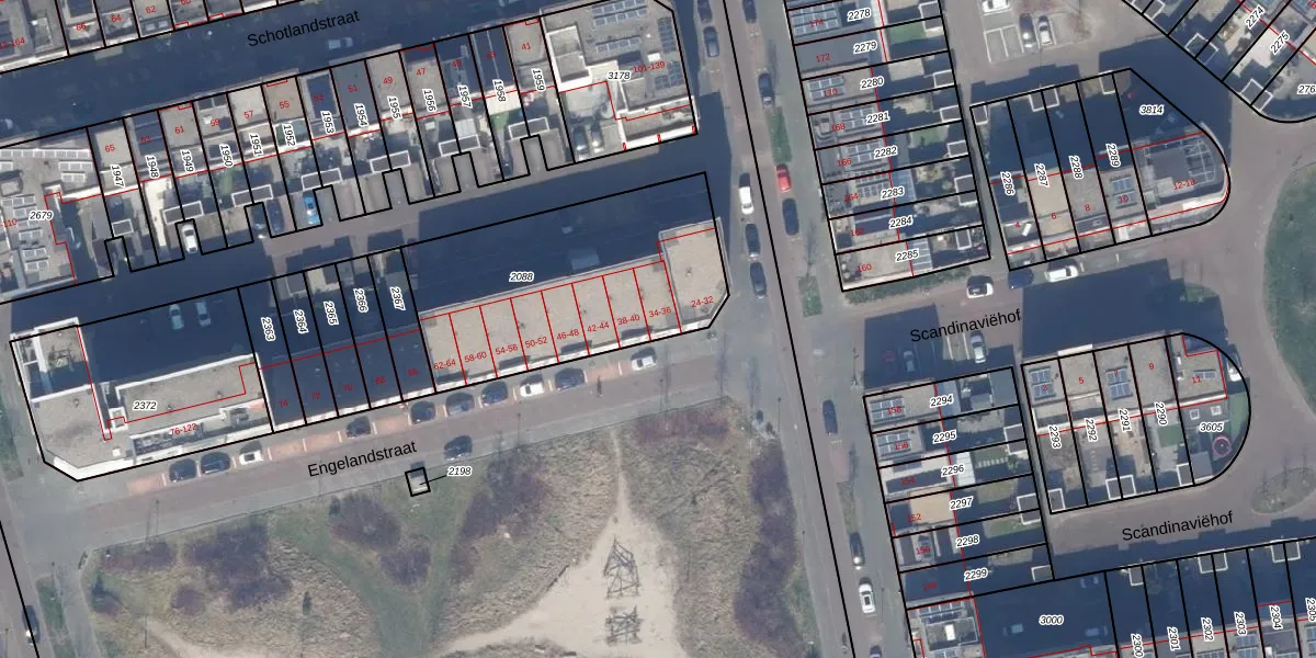 Engelandstraat 36 is gelegen op kadastraal perceel AMR04W2088. Deze kadastrale aanduiding is uniek en wordt gebruikt door het Kadaster om eigendomsrechten en andere zakelijke rechten vast te leggen. Het perceel maakt onderdeel uit van de kadastrale gemeente Almere.