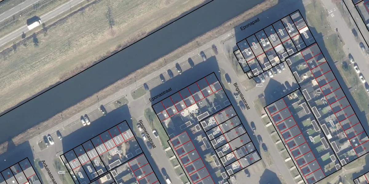 Eponastraat 9 is gelegen op kadastraal perceel AMR04W2532. Deze kadastrale aanduiding is uniek en wordt gebruikt door het Kadaster om eigendomsrechten en andere zakelijke rechten vast te leggen. Het perceel maakt onderdeel uit van de kadastrale gemeente Almere.