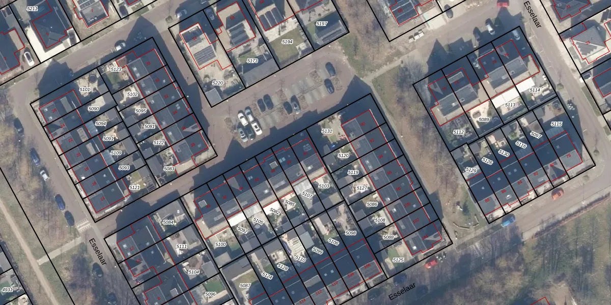 Het perceel waarop Esselaar 52 staat heeft een oppervlakte van 188 m². Dit is een middelgroot perceel. De perceeloppervlakte wordt geregistreerd door het Kadaster. Gedetailleerde informatie over de maten van dit perceel kunt u vinden in het rapport Kadastrale kaart met maatvoering van Esselaar 52.