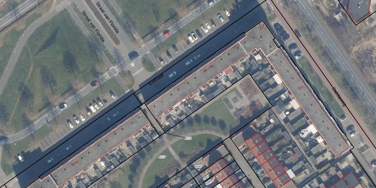 Het perceel waarop Evenaar 100 staat heeft een oppervlakte van 5188 m². Dit is een zeer groot perceel. De perceeloppervlakte wordt geregistreerd door het Kadaster. Gedetailleerde informatie over de maten van dit perceel kunt u vinden in het rapport Kadastrale kaart met maatvoering van Evenaar 100.
