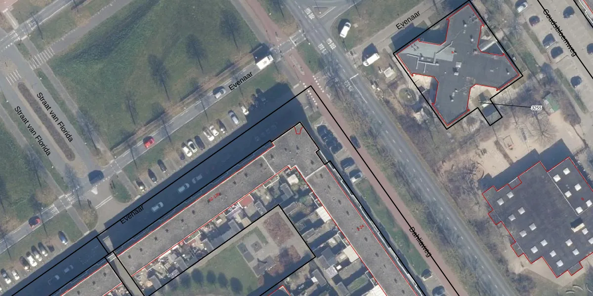 Het perceel waarop Evenaar 128 staat heeft een oppervlakte van 5188 m². Dit is een zeer groot perceel. De perceeloppervlakte wordt geregistreerd door het Kadaster. Gedetailleerde informatie over de maten van dit perceel kunt u vinden in het rapport Kadastrale kaart met maatvoering van Evenaar 128.