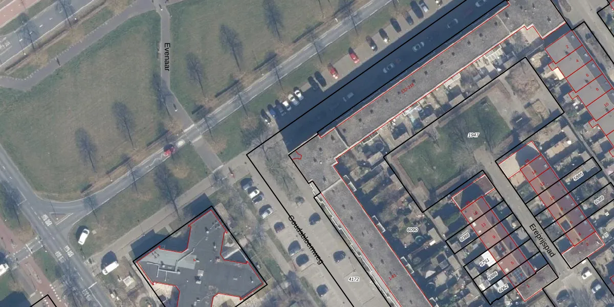 Het perceel waarop Evenaar 132 staat heeft een oppervlakte van 8396 m². Dit is een zeer groot perceel. De perceeloppervlakte wordt geregistreerd door het Kadaster. Gedetailleerde informatie over de maten van dit perceel kunt u vinden in het rapport Kadastrale kaart met maatvoering van Evenaar 132.