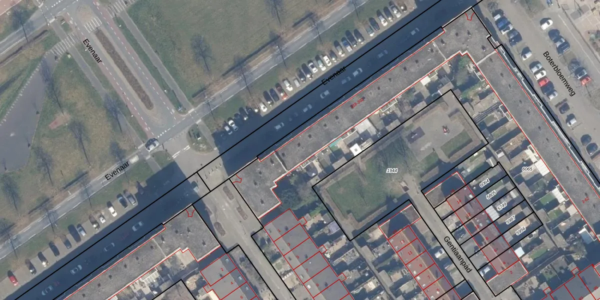 Het perceel waarop Evenaar 240 staat heeft een oppervlakte van 8354 m². Dit is een zeer groot perceel. De perceeloppervlakte wordt geregistreerd door het Kadaster. Gedetailleerde informatie over de maten van dit perceel kunt u vinden in het rapport Kadastrale kaart met maatvoering van Evenaar 240.