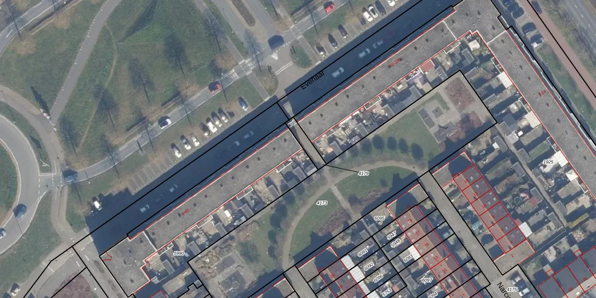 Het perceel waarop Evenaar 30 staat heeft een oppervlakte van 1672 m². Dit is een zeer groot perceel. De perceeloppervlakte wordt geregistreerd door het Kadaster. Gedetailleerde informatie over de maten van dit perceel kunt u vinden in het rapport Kadastrale kaart met maatvoering van Evenaar 30.