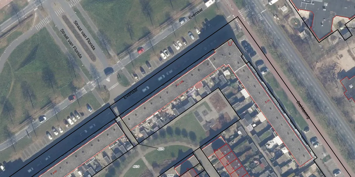 Het perceel waarop Evenaar 74 staat heeft een oppervlakte van 5188 m². Dit is een zeer groot perceel. De perceeloppervlakte wordt geregistreerd door het Kadaster. Gedetailleerde informatie over de maten van dit perceel kunt u vinden in het rapport Kadastrale kaart met maatvoering van Evenaar 74.