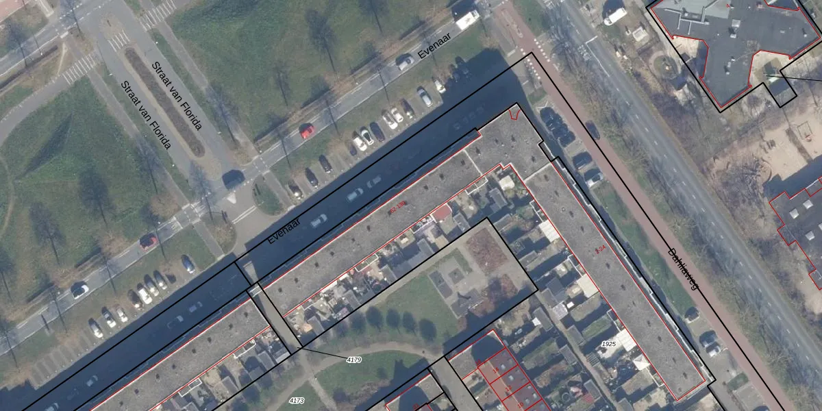 Het perceel waarop Evenaar 76 staat heeft een oppervlakte van 5188 m². Dit is een zeer groot perceel. De perceeloppervlakte wordt geregistreerd door het Kadaster. Gedetailleerde informatie over de maten van dit perceel kunt u vinden in het rapport Kadastrale kaart met maatvoering van Evenaar 76.