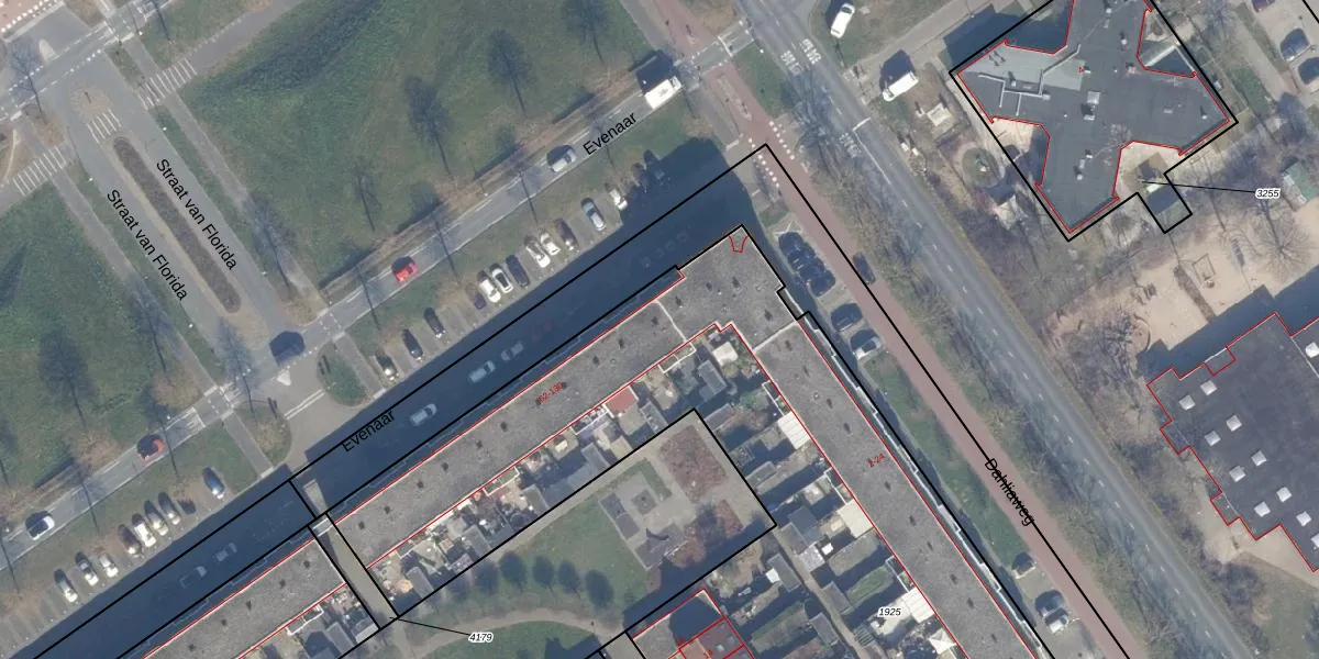 Het perceel waarop Evenaar 82 staat heeft een oppervlakte van 5188 m². Dit is een zeer groot perceel. De perceeloppervlakte wordt geregistreerd door het Kadaster. Gedetailleerde informatie over de maten van dit perceel kunt u vinden in het rapport Kadastrale kaart met maatvoering van Evenaar 82.