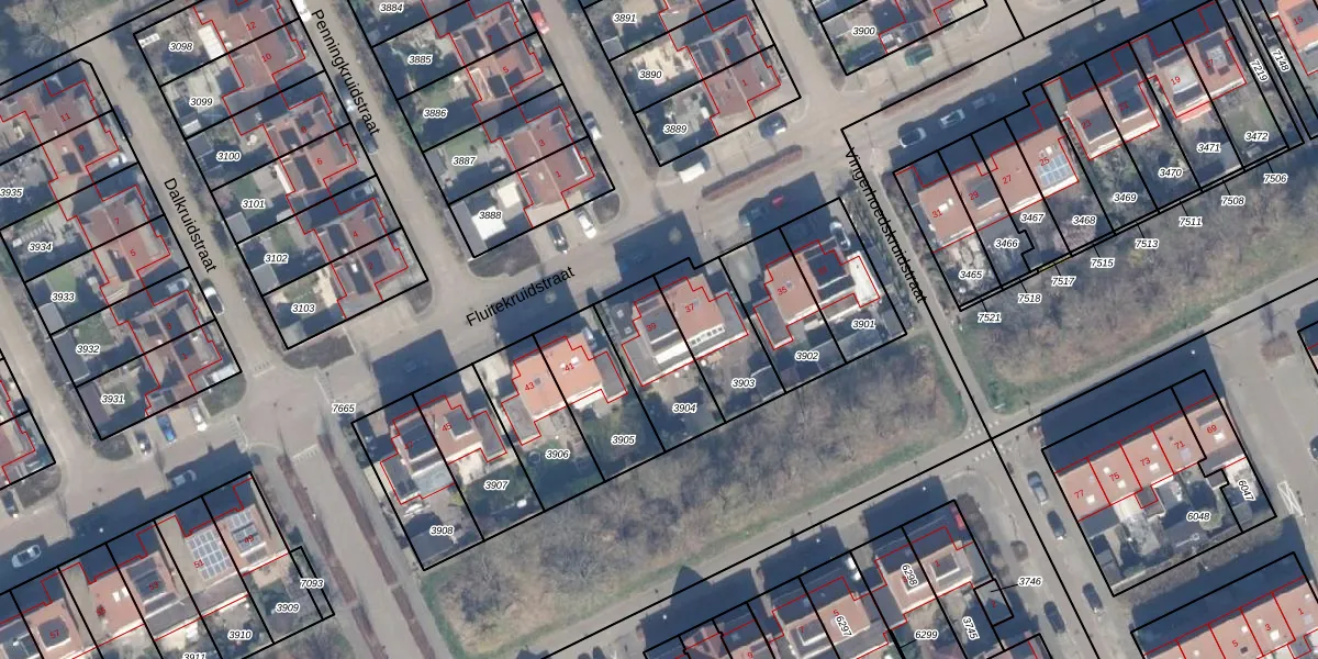 Fluitekruidstraat 39 is gelegen op kadastraal perceel AMR04O3904. Deze kadastrale aanduiding is uniek en wordt gebruikt door het Kadaster om eigendomsrechten en andere zakelijke rechten vast te leggen. Het perceel maakt onderdeel uit van de kadastrale gemeente Almere.