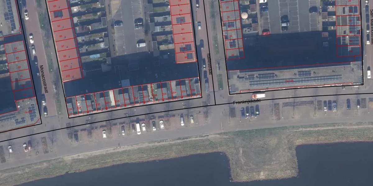 Het perceel waarop Frankrijkkade 202 staat heeft een oppervlakte van 1,2 ha. Dit is een zeer groot perceel. De perceeloppervlakte wordt geregistreerd door het Kadaster. Gedetailleerde informatie over de maten van dit perceel kunt u vinden in het rapport Kadastrale kaart met maatvoering van Frankrijkkade 202.