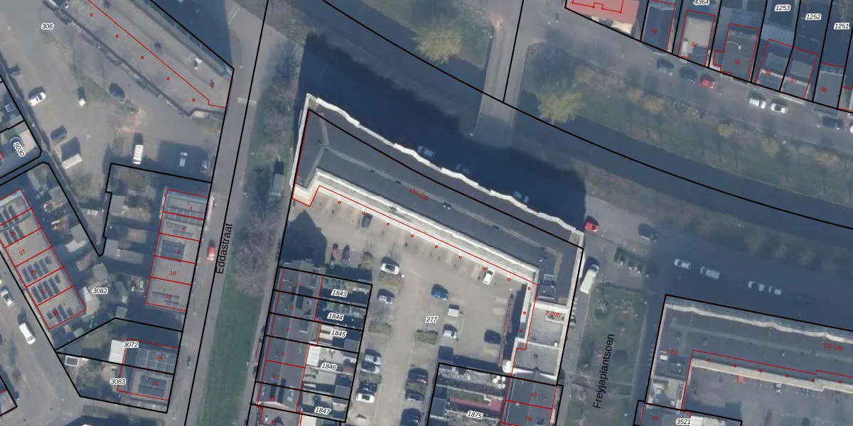 Het perceel waarop Freyjaplantsoen 46 staat heeft een oppervlakte van 3827 m². Dit is een zeer groot perceel. De perceeloppervlakte wordt geregistreerd door het Kadaster. Gedetailleerde informatie over de maten van dit perceel kunt u vinden in het rapport Kadastrale kaart met maatvoering van Freyjaplantsoen 46.