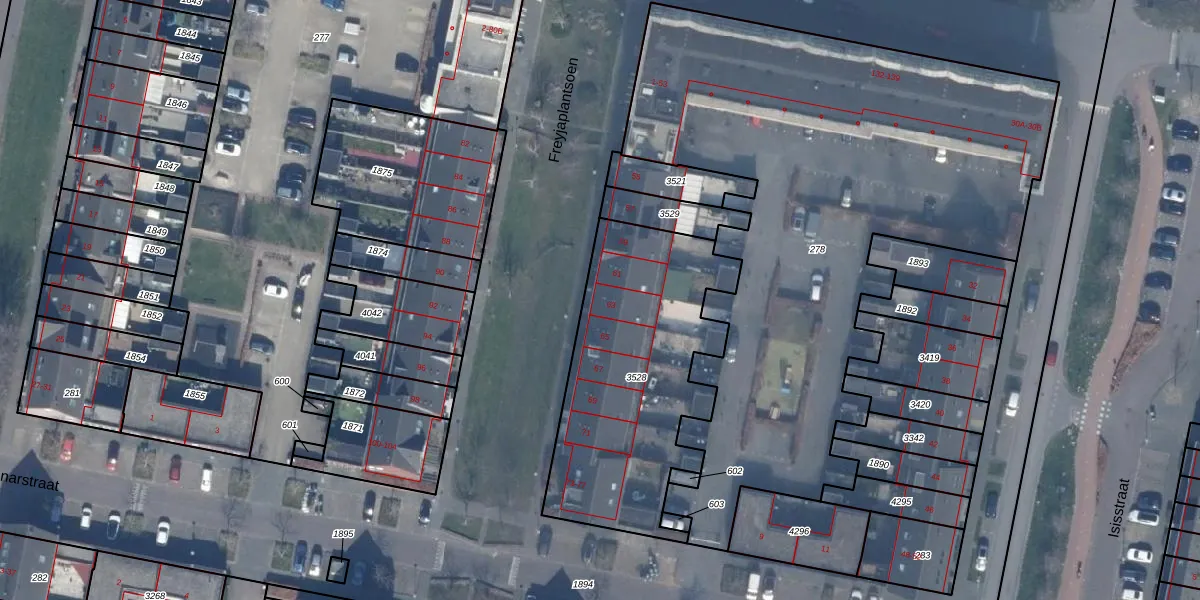 Het perceel waarop Freyjaplantsoen 63 staat heeft een oppervlakte van 1110 m². Dit is een zeer groot perceel. De perceeloppervlakte wordt geregistreerd door het Kadaster. Gedetailleerde informatie over de maten van dit perceel kunt u vinden in het rapport Kadastrale kaart met maatvoering van Freyjaplantsoen 63.