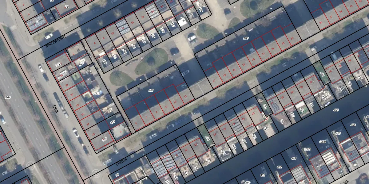 Gaffel 15 is gelegen op kadastraal perceel AMR04E187. Deze kadastrale aanduiding is uniek en wordt gebruikt door het Kadaster om eigendomsrechten en andere zakelijke rechten vast te leggen. Het perceel maakt onderdeel uit van de kadastrale gemeente Almere.