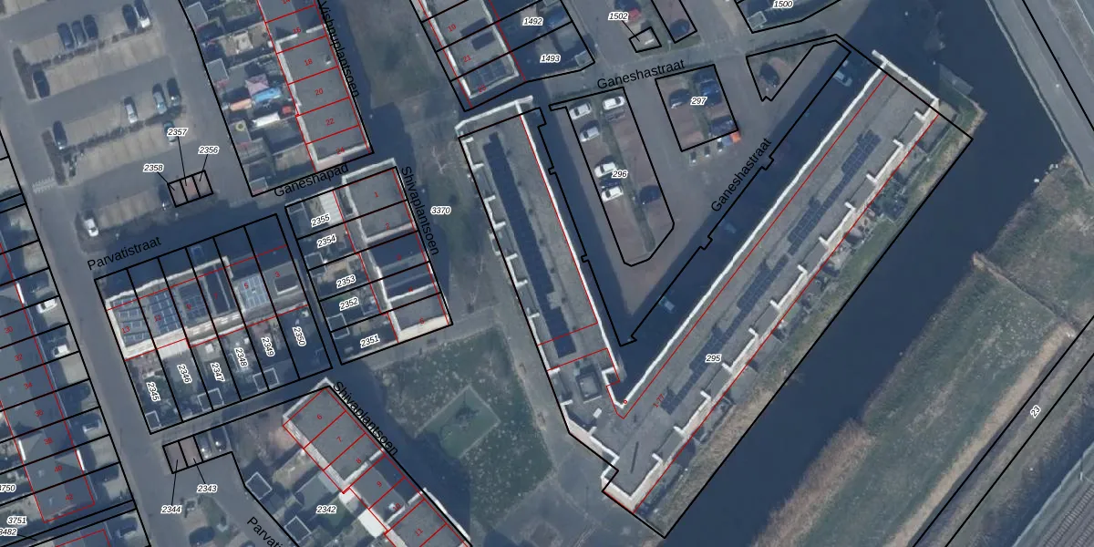 Het perceel waarop Ganeshastraat 31 staat heeft een oppervlakte van 3269 m². Dit is een zeer groot perceel. De perceeloppervlakte wordt geregistreerd door het Kadaster. Gedetailleerde informatie over de maten van dit perceel kunt u vinden in het rapport Kadastrale kaart met maatvoering van Ganeshastraat 31.