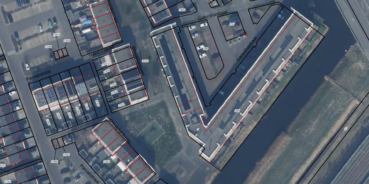 Het perceel waarop Ganeshastraat 32 staat heeft een oppervlakte van 3269 m². Dit is een zeer groot perceel. De perceeloppervlakte wordt geregistreerd door het Kadaster. Gedetailleerde informatie over de maten van dit perceel kunt u vinden in het rapport Kadastrale kaart met maatvoering van Ganeshastraat 32.