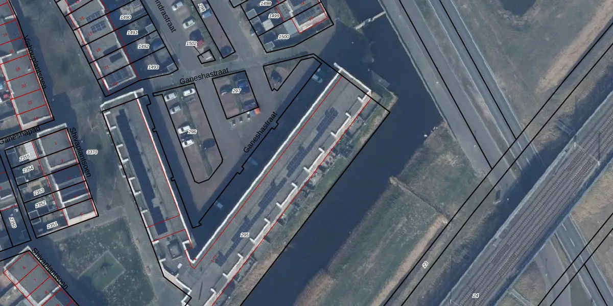 Het perceel waarop Ganeshastraat 63 staat heeft een oppervlakte van 3269 m². Dit is een zeer groot perceel. De perceeloppervlakte wordt geregistreerd door het Kadaster. Gedetailleerde informatie over de maten van dit perceel kunt u vinden in het rapport Kadastrale kaart met maatvoering van Ganeshastraat 63.