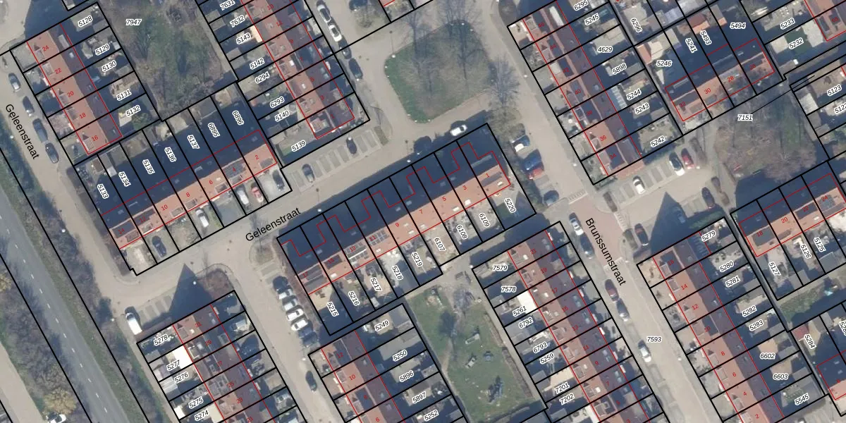 Geleenstraat 7 is gelegen op kadastraal perceel AMR04K6107. Deze kadastrale aanduiding is uniek en wordt gebruikt door het Kadaster om eigendomsrechten en andere zakelijke rechten vast te leggen. Het perceel maakt onderdeel uit van de kadastrale gemeente Almere.