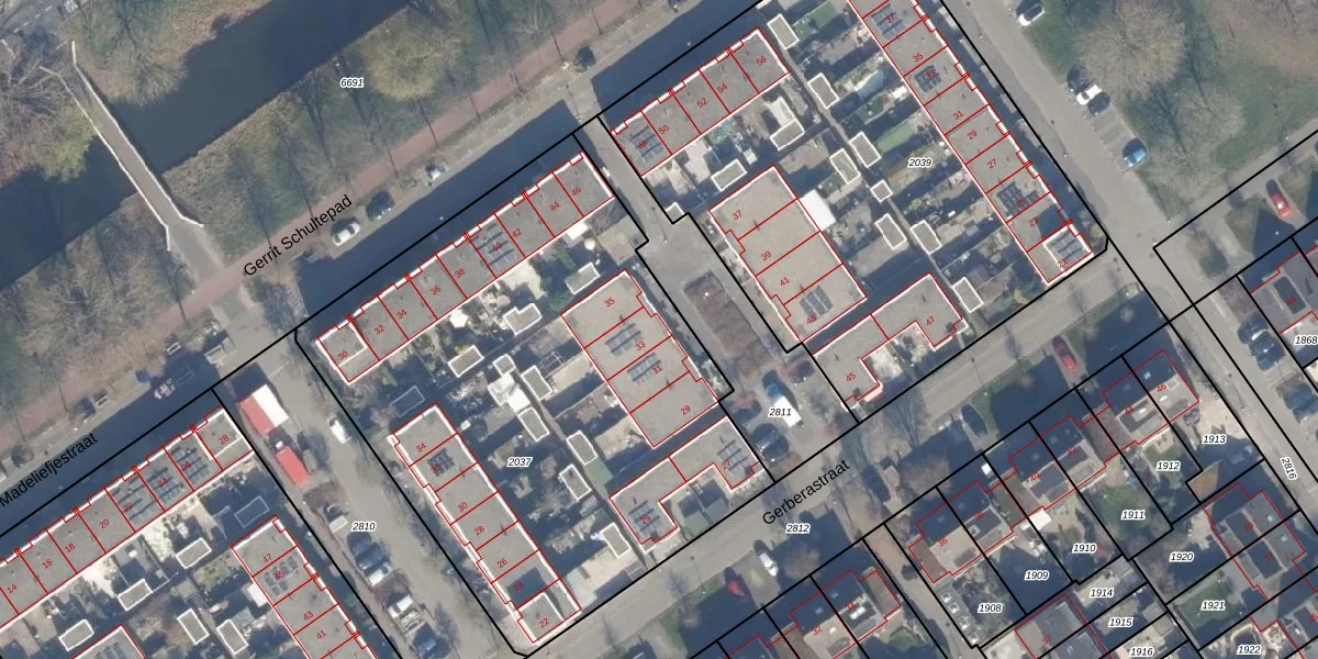 Het perceel waarop Gerberastraat 33 staat heeft een oppervlakte van 3060 m². Dit is een zeer groot perceel. De perceeloppervlakte wordt geregistreerd door het Kadaster. Gedetailleerde informatie over de maten van dit perceel kunt u vinden in het rapport Kadastrale kaart met maatvoering van Gerberastraat 33.