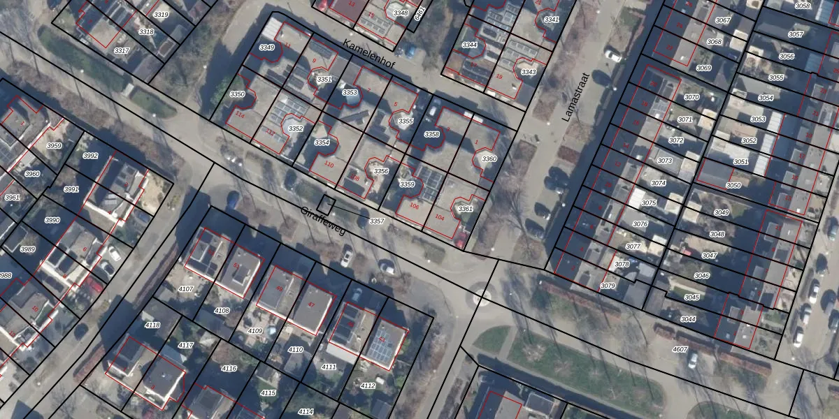 Giraffeweg 106 is gelegen op kadastraal perceel AMR04N3359. Deze kadastrale aanduiding is uniek en wordt gebruikt door het Kadaster om eigendomsrechten en andere zakelijke rechten vast te leggen. Het perceel maakt onderdeel uit van de kadastrale gemeente Almere.