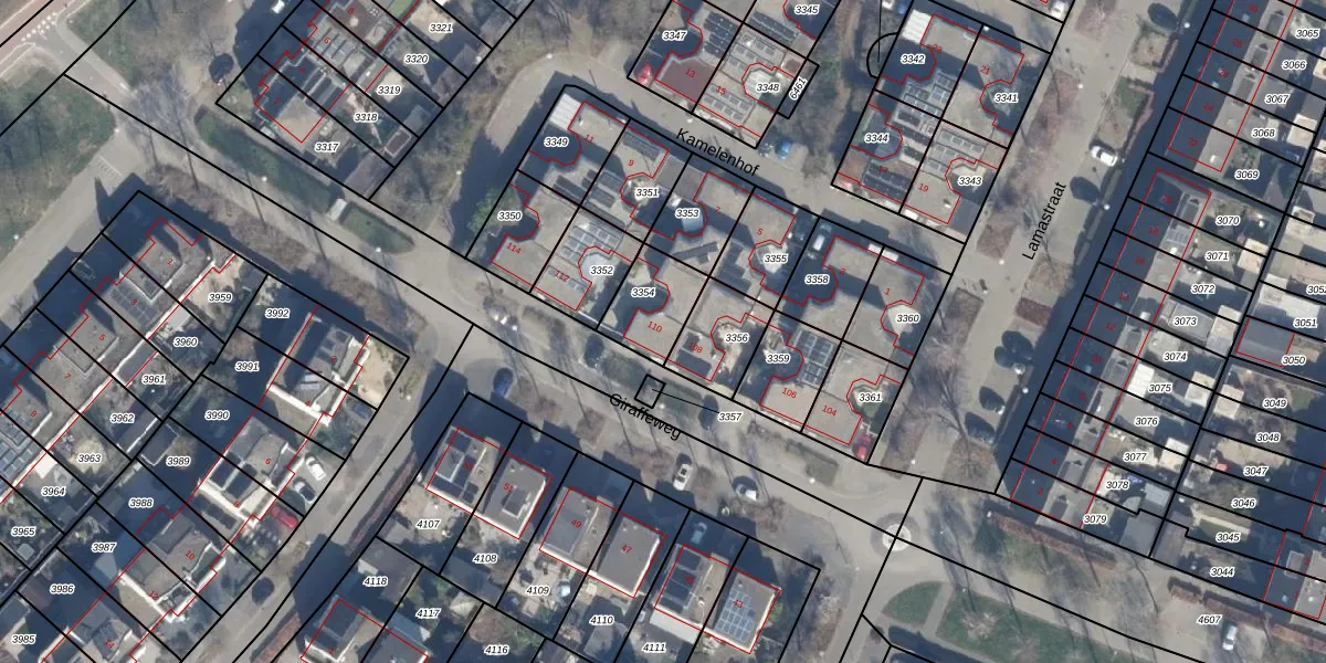 Giraffeweg 110 is gelegen op kadastraal perceel AMR04N3354. Deze kadastrale aanduiding is uniek en wordt gebruikt door het Kadaster om eigendomsrechten en andere zakelijke rechten vast te leggen. Het perceel maakt onderdeel uit van de kadastrale gemeente Almere.