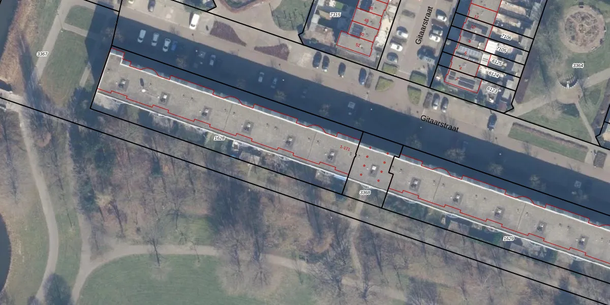 Het perceel waarop Gitaarstraat 113 staat heeft een oppervlakte van 1905 m². Dit is een zeer groot perceel. De perceeloppervlakte wordt geregistreerd door het Kadaster. Gedetailleerde informatie over de maten van dit perceel kunt u vinden in het rapport Kadastrale kaart met maatvoering van Gitaarstraat 113.