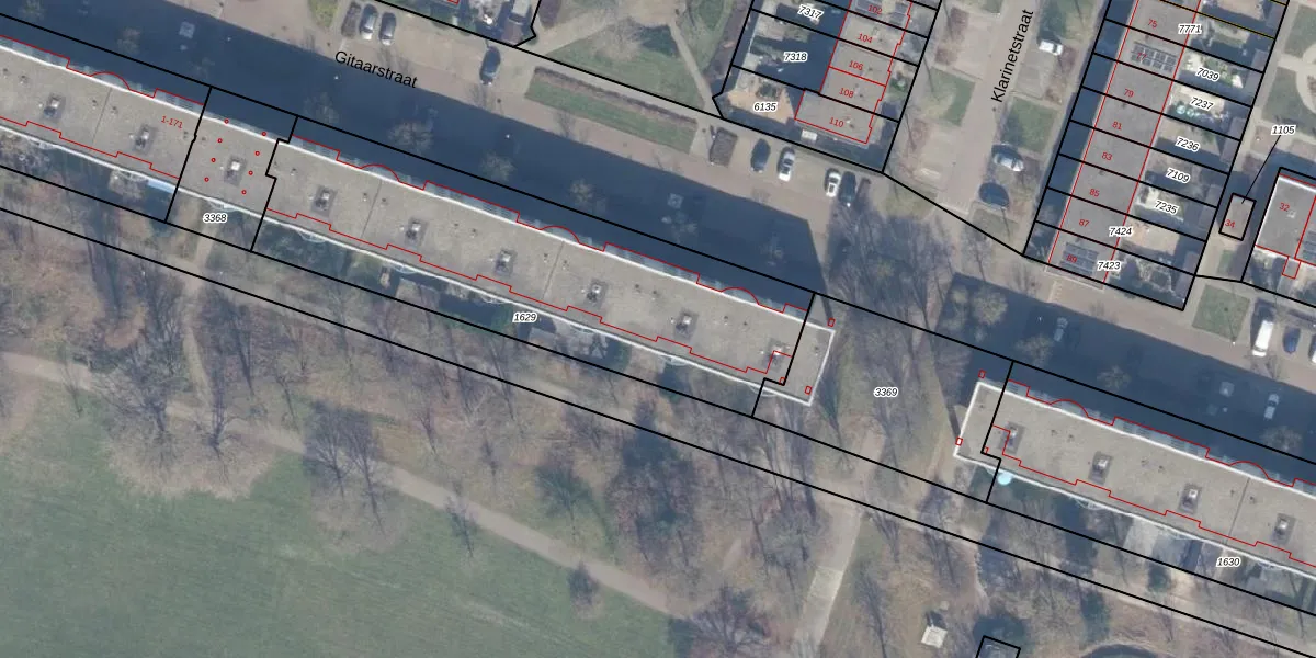 Het perceel waarop Gitaarstraat 21 staat heeft een oppervlakte van 1770 m². Dit is een zeer groot perceel. De perceeloppervlakte wordt geregistreerd door het Kadaster. Gedetailleerde informatie over de maten van dit perceel kunt u vinden in het rapport Kadastrale kaart met maatvoering van Gitaarstraat 21.