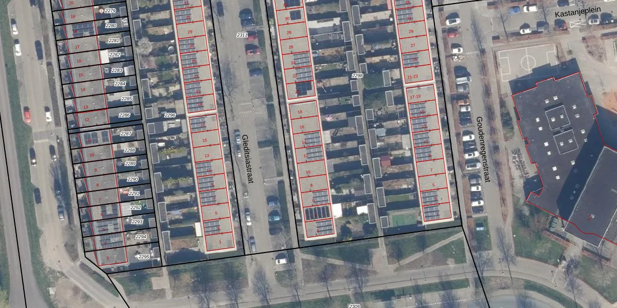 Het perceel waarop Gleditsiastraat 12 staat heeft een oppervlakte van 5191 m². Dit is een zeer groot perceel. De perceeloppervlakte wordt geregistreerd door het Kadaster. Gedetailleerde informatie over de maten van dit perceel kunt u vinden in het rapport Kadastrale kaart met maatvoering van Gleditsiastraat 12.
