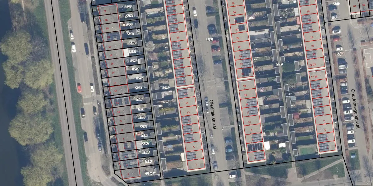 Het perceel waarop Gleditsiastraat 17 staat heeft een oppervlakte van 2662 m². Dit is een zeer groot perceel. De perceeloppervlakte wordt geregistreerd door het Kadaster. Gedetailleerde informatie over de maten van dit perceel kunt u vinden in het rapport Kadastrale kaart met maatvoering van Gleditsiastraat 17.