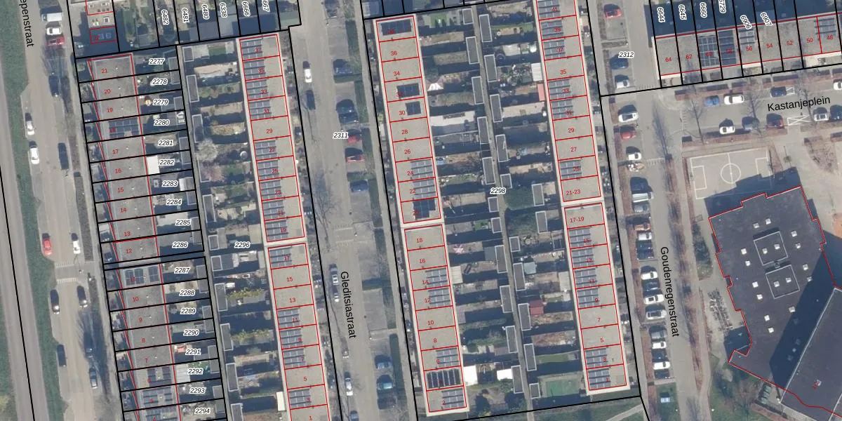 Het perceel waarop Gleditsiastraat 20 staat heeft een oppervlakte van 5191 m². Dit is een zeer groot perceel. De perceeloppervlakte wordt geregistreerd door het Kadaster. Gedetailleerde informatie over de maten van dit perceel kunt u vinden in het rapport Kadastrale kaart met maatvoering van Gleditsiastraat 20.