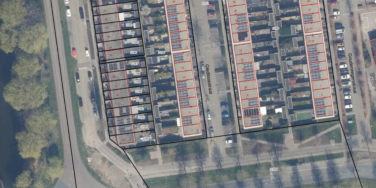 Het perceel waarop Gleditsiastraat 9 staat heeft een oppervlakte van 2662 m². Dit is een zeer groot perceel. De perceeloppervlakte wordt geregistreerd door het Kadaster. Gedetailleerde informatie over de maten van dit perceel kunt u vinden in het rapport Kadastrale kaart met maatvoering van Gleditsiastraat 9.