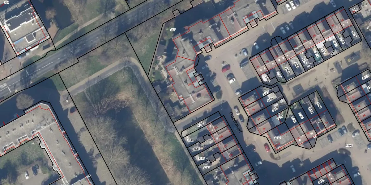 Het perceel waarop Goedewerf 139 staat heeft een oppervlakte van 2417 m². Dit is een zeer groot perceel. De perceeloppervlakte wordt geregistreerd door het Kadaster. Gedetailleerde informatie over de maten van dit perceel kunt u vinden in het rapport Kadastrale kaart met maatvoering van Goedewerf 139.