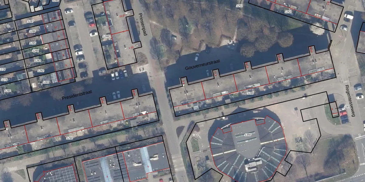 Het perceel waarop Gouverneurstraat 2 staat heeft een oppervlakte van 1465 m². Dit is een zeer groot perceel. De perceeloppervlakte wordt geregistreerd door het Kadaster. Gedetailleerde informatie over de maten van dit perceel kunt u vinden in het rapport Kadastrale kaart met maatvoering van Gouverneurstraat 2.
