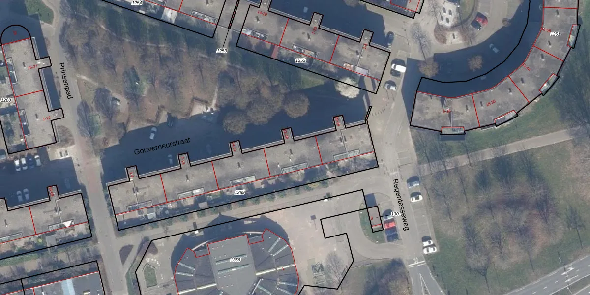 Het perceel waarop Gouverneurstraat 22 staat heeft een oppervlakte van 1465 m². Dit is een zeer groot perceel. De perceeloppervlakte wordt geregistreerd door het Kadaster. Gedetailleerde informatie over de maten van dit perceel kunt u vinden in het rapport Kadastrale kaart met maatvoering van Gouverneurstraat 22.