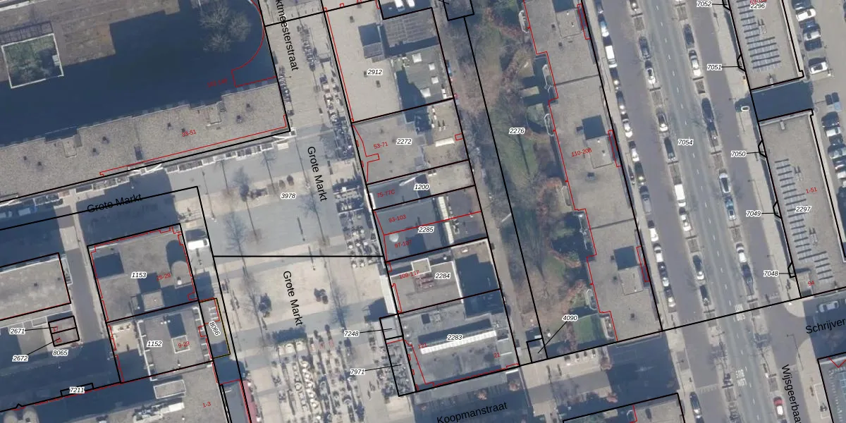 Het perceel waarop Grote Markt 99 staat heeft een oppervlakte van 315 m². Dit is een groot perceel. De perceeloppervlakte wordt geregistreerd door het Kadaster. Gedetailleerde informatie over de maten van dit perceel kunt u vinden in het rapport Kadastrale kaart met maatvoering van Grote Markt 99.