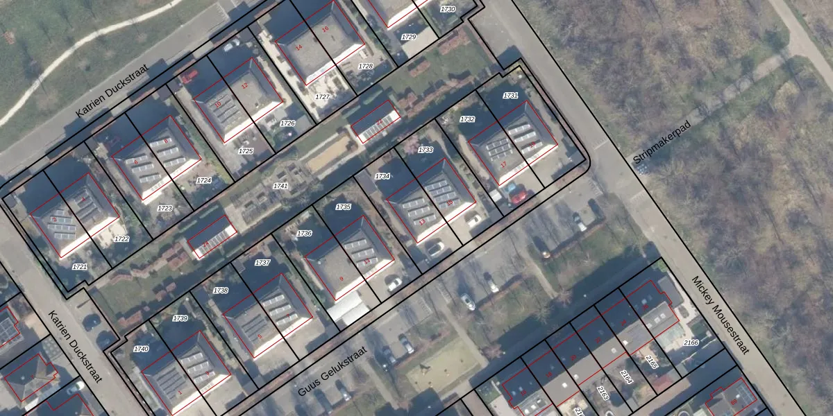 Het perceel waarop Guus Gelukstraat 13 staat heeft een oppervlakte van 348 m². Dit is een groot perceel. De perceeloppervlakte wordt geregistreerd door het Kadaster. Gedetailleerde informatie over de maten van dit perceel kunt u vinden in het rapport Kadastrale kaart met maatvoering van Guus Gelukstraat 13.