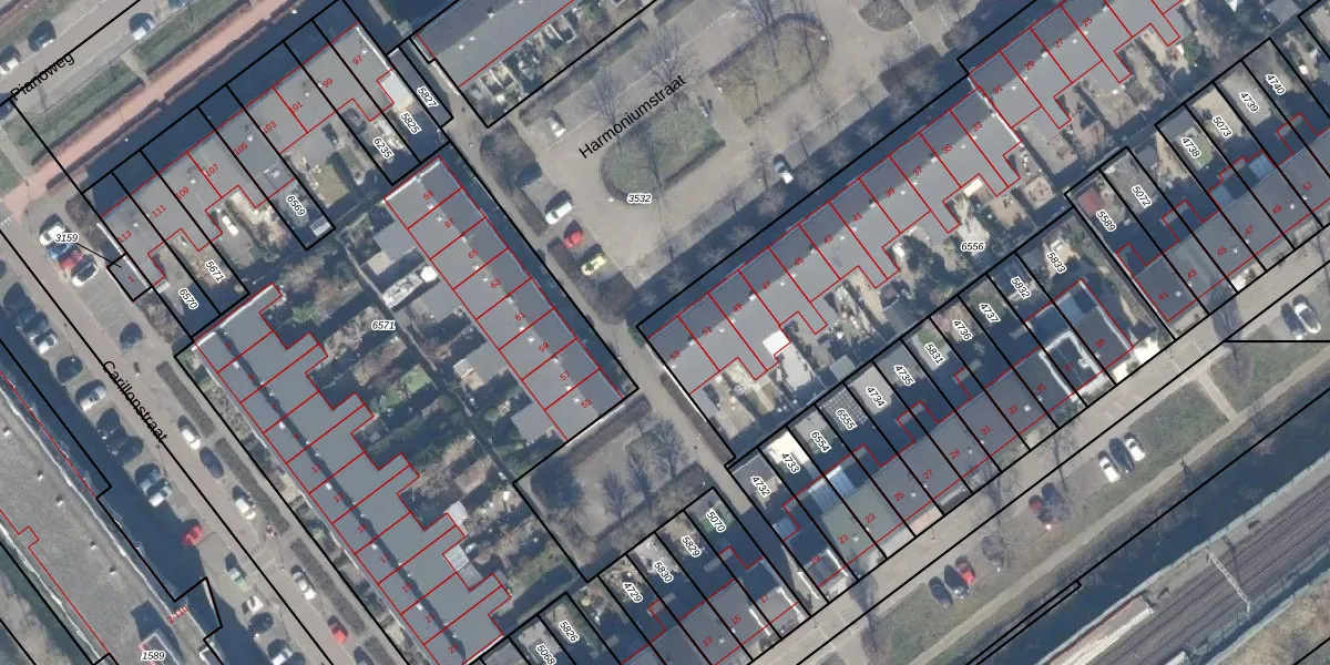 Het perceel waarop Harmoniumstraat 53 staat heeft een oppervlakte van 4357 m². Dit is een zeer groot perceel. De perceeloppervlakte wordt geregistreerd door het Kadaster. Gedetailleerde informatie over de maten van dit perceel kunt u vinden in het rapport Kadastrale kaart met maatvoering van Harmoniumstraat 53.