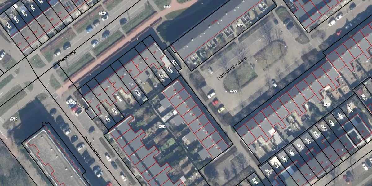 Het perceel waarop Harmoniumstraat 67 staat heeft een oppervlakte van 3692 m². Dit is een zeer groot perceel. De perceeloppervlakte wordt geregistreerd door het Kadaster. Gedetailleerde informatie over de maten van dit perceel kunt u vinden in het rapport Kadastrale kaart met maatvoering van Harmoniumstraat 67.